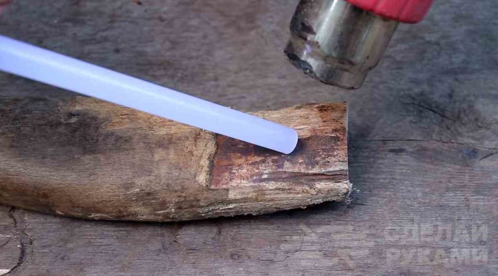 На следующем этапе автор берет клеевые стержни и газовый баллончик с горелкой. При помощи клея автор «наращивает» ту часть топорища, которая входит в проушину.
