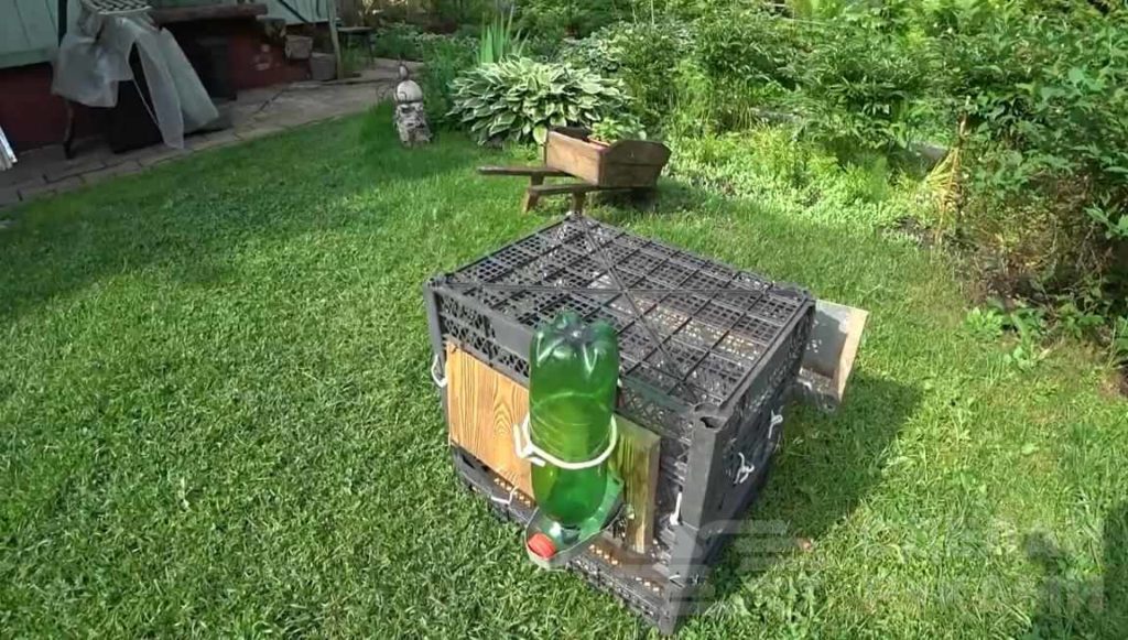 Сама поилка самодельная — вакуумного типа. Изготовлена из пластиковых бутылок. Конструкция очень простая и всем известная. Из куска ДСП автор сделал дверцу, которая закрывает отверстие для «загрузки и выгрузки» птицы.