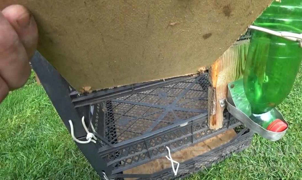 Небольшие зазоры, которые образовались между вторым и третьим пластмассовыми ящиками, обеспечивают цыплятам доступ к кормушке и поилке.