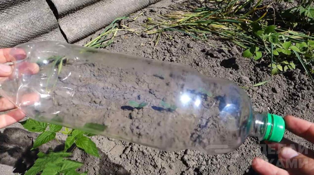 Далее устанавливаем бутылку в нужном месте и наполняем ее водой до верха. Для полива растений вода должна быть теплой.