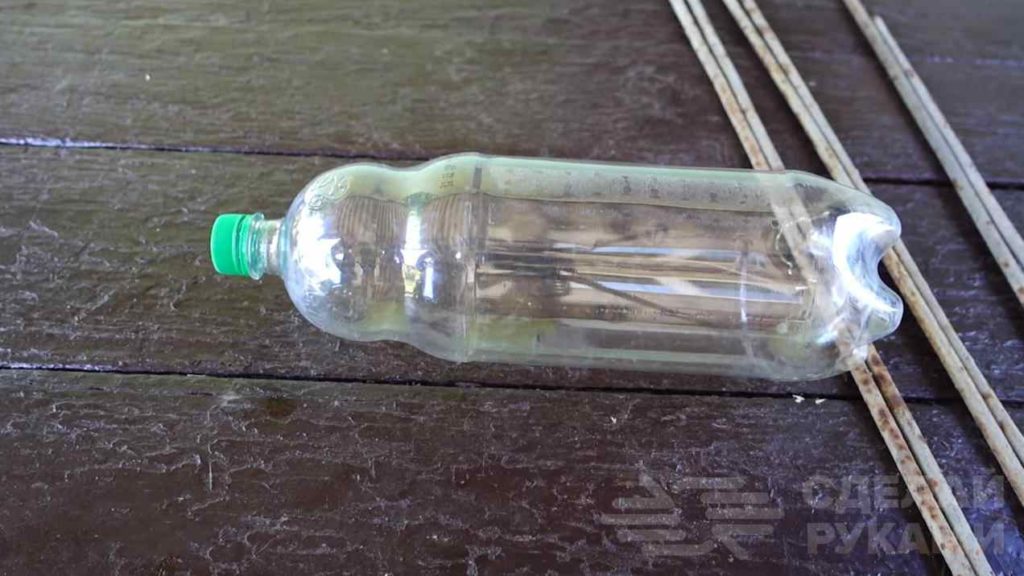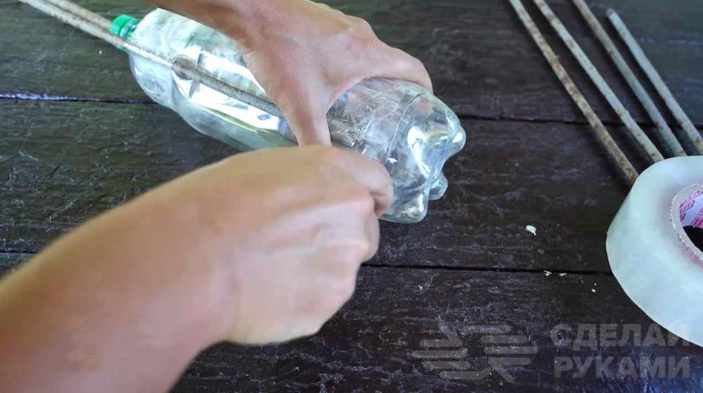 Первым делом с помощью скотча необходимо примотать к бутылке 2-3 металлических прутка, которые будут выступать в качестве ножек. Затем ножом отрезаем дно ПЭТ-бутылки.
