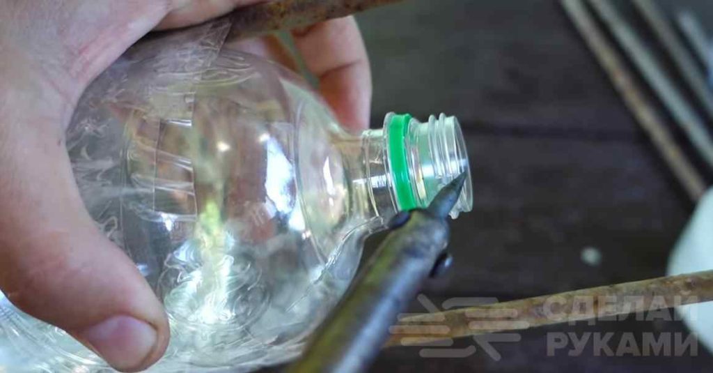 На следующем этапе с помощью паяльника или ножовки по металлу в горлышке бутылки нужно сделать 2-3 прорези глубиной до 3 мм. Это требуется для того, чтобы даже при полном закручивании крышка все равно пропускала воду.