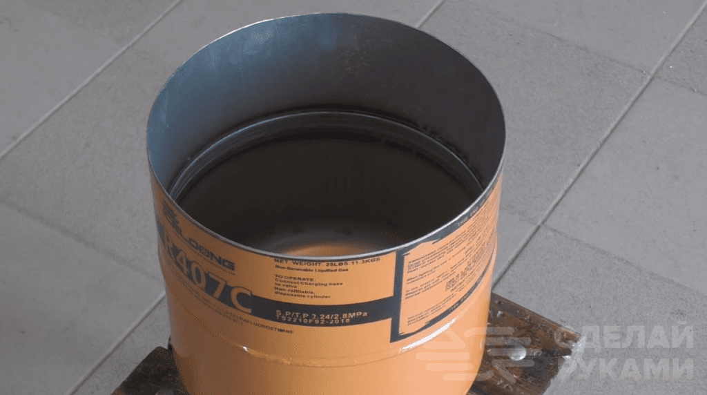 Первым делом необходимо при помощи перманентного маркера сделать разметку по всей окружности фреонового баллона. После этого берем угловую шлифмашинку с отрезным диском и отрезаем по разметке верхнюю часть. Перед резкой обязательно убедитесь, что баллон пустой.