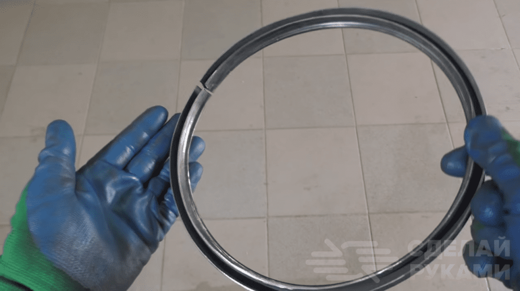 Чтобы сделать гидрозатвор для самодельной коптильни, будем использовать профильную трубу с размерами сторон 15х15 мм. Отрезаем болгаркой кусок профиля длиной 90 см (+10 см к диаметру баллона), который нужно согнуть в кольцо. Для этого можно использовать гибочный станок.