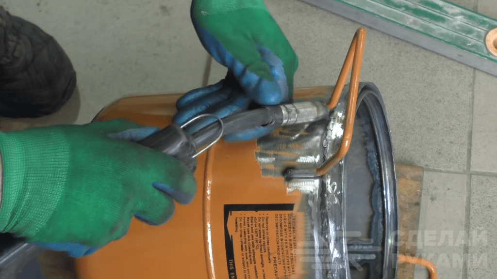 На следующем этапе привариваем кольцо к фреоновому баллону, сверху устанавливаем срезанную верхнюю часть. По бокам корпуса нужно будет приварить ручки для переноски коптильни. Далее отрезаем вентиль и рассверливаем отверстие сверлом диаметром 8 мм.