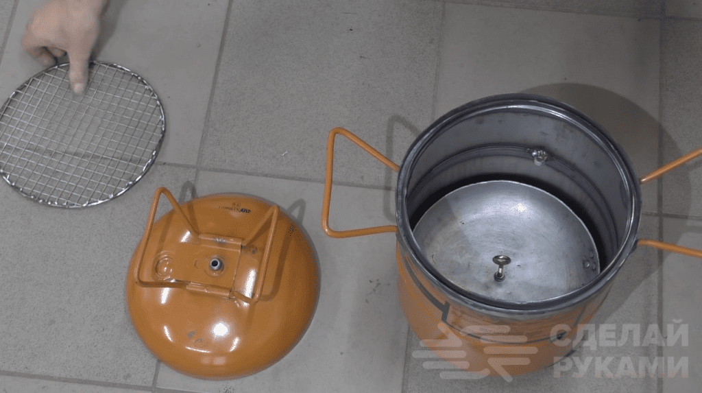Емкость для сбора жира можно изготовить из алюминиевой сковородки, подходящей по диаметру (новую сковороду покупать не обязательно — подойдет и старая). В качестве решетки для мяса или других продуктов копчения можно использовать обычную строительную сетку.