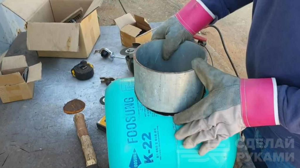 Первым делом автор срезает ручки и вентиль. Потом делает разметку и вырезает в верхней части баллона круг нужного диаметра.