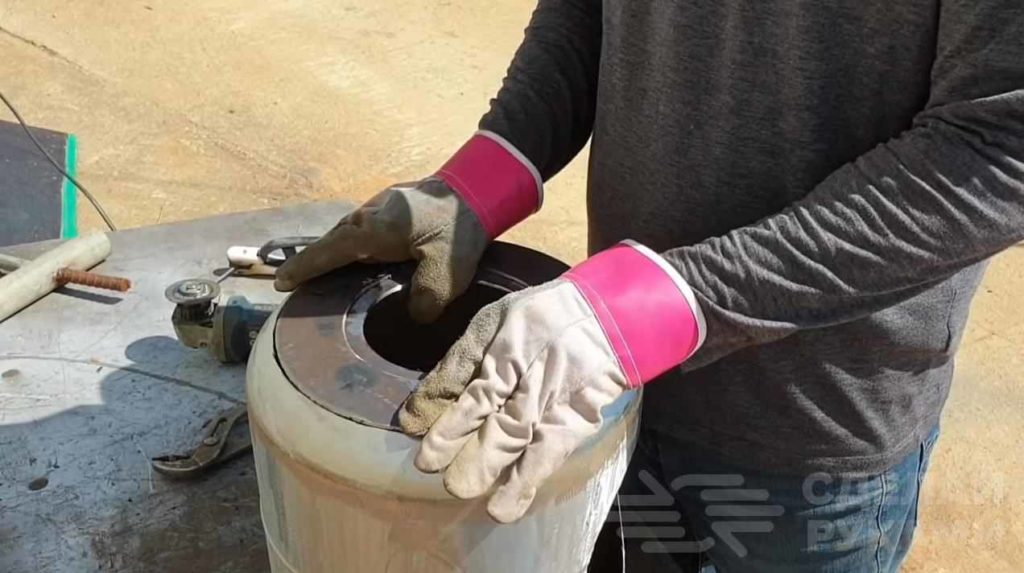 Сбоку баллона также необходимо вырезать с помощью УШМ отверстие, а потом приварить кусок круглой трубы.