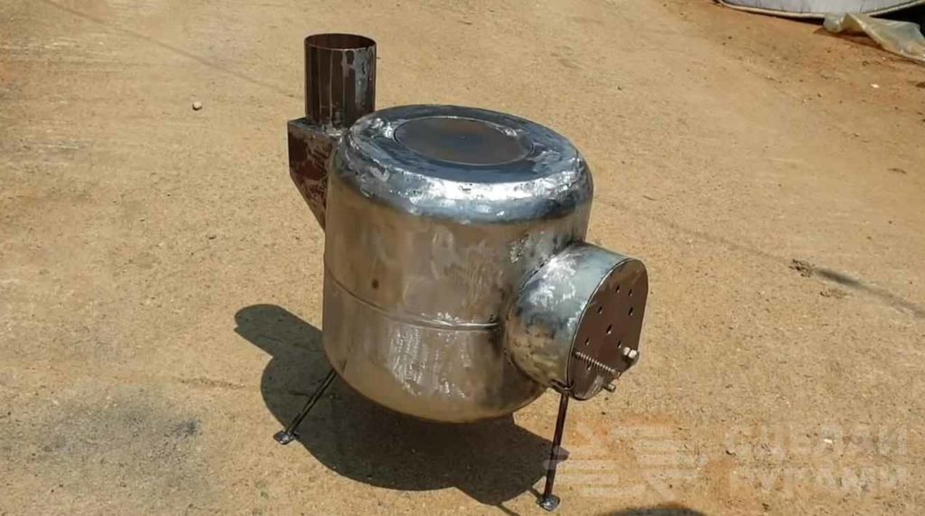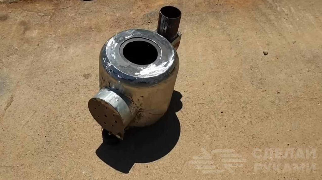 На последнем этапе останется только приварить крепление для дымоходной трубы, а также сделать круглую дверцу для доступа к топочной камере.