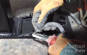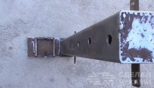 Далее потребуется отрезать две заготовки разных размеров из стальной широкой полосы, которые нужно сварить между собой перпендикулярно под прямым углом. В основании получившейся детали, а также в профильной трубе необходимо просверлить по два отверстия.