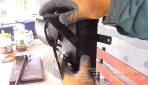 Для начала потребуется отрезать кусок толстой металлической пластины длиной примерно 27–28 см и шириной 12 см, поверхность которой необходимо отшлифовать болгаркой. Также нужен будет отрезок профильной трубы со сторонами 80х80 мм длиной 68–70 см.