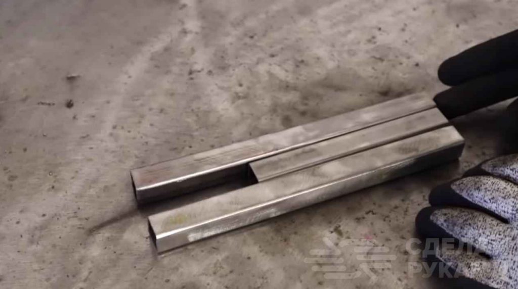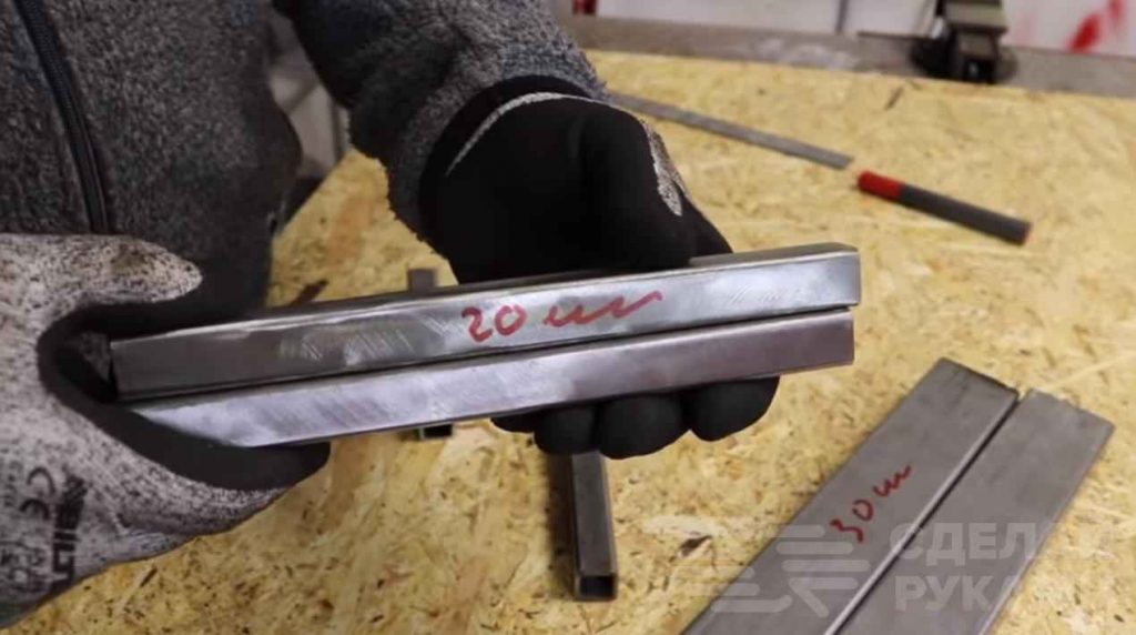 Из основных материалов потребуются отрезки профильной трубы разной длины (15, 20 и 30 см), а также металлическая пластина. Заготовки можно нарезать на ленточной пиле или же с помощью угловой шлифмашинки.