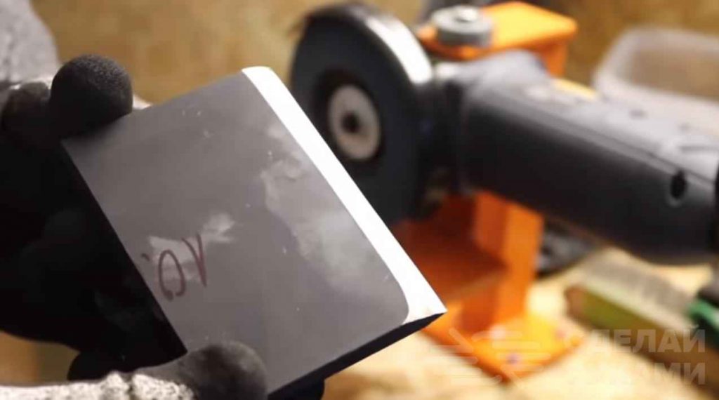 Режущий нож для настольного щепокола-рычага мастер делает из отрезка прямоугольной пластины длиной 10 см. Заточить режущую кромку можно с помощью угловой шлифмашины.