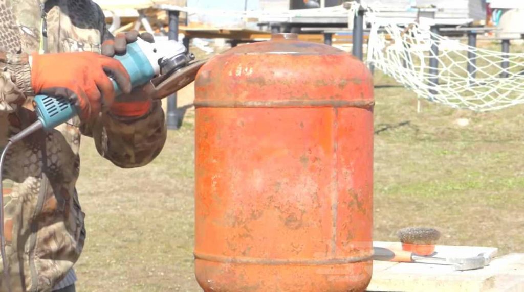 Первым делом необходимо открутить вентиль на баллоне, а потом заполнить его водой. Без этого начинать резать его болгаркой нельзя! Потом автор отрезает все лишнее. Далее надо зачистить баллон лепестковым кругом.