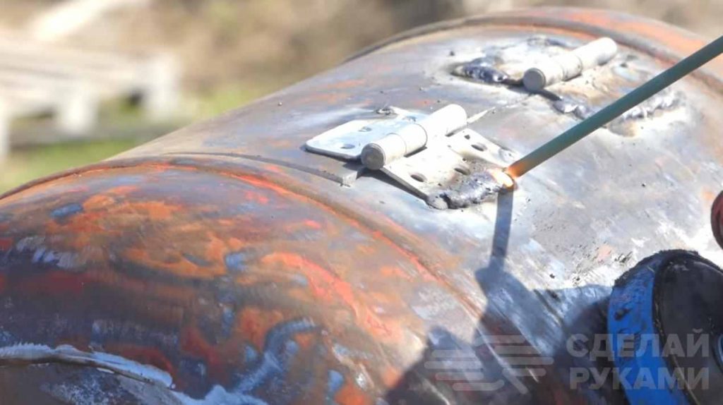 На следующем этапе необходимо будет сделать разметку, и вырезать дверцу для загрузки дров. Дверца приваривается на две петли. Сварные швы надо будет зачистить болгаркой.