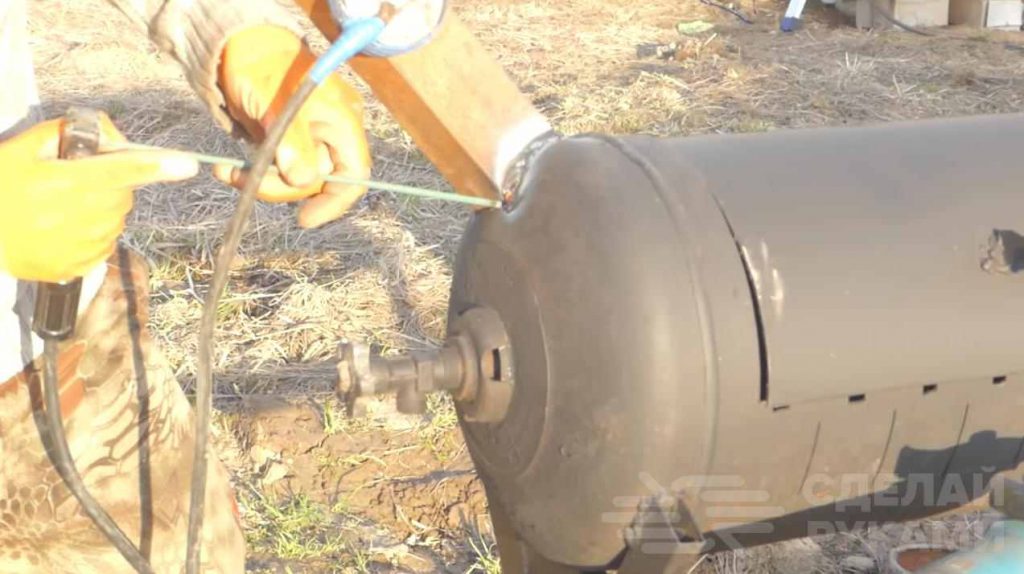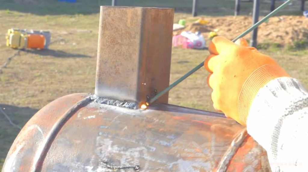 Чтобы соединить два баллона, автор использует профильную трубу 100*100 мм. Надо сделать разметку и вырезать два отверстия под трубу. Потом автор приваривает профильную трубу сначала к маленькому баллону, а потом — к мангалу.