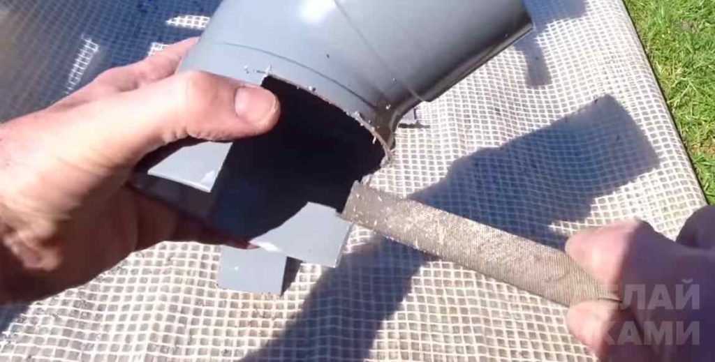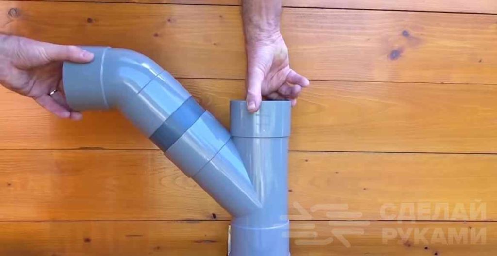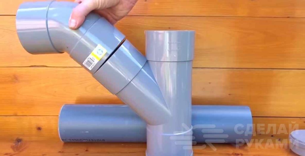 Первым делом необходимо будет отрезать кусок пластиковой трубы, с помощью которого будут соединяться тройник и отвод.