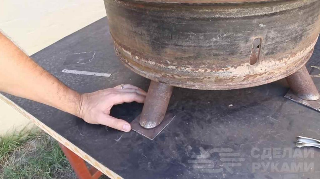 Для начала определим место, где будут располагаться ножки. На нижней части обода делаем разметку. Отрезаем куски трубы необходимого размера и привариваем их на свои места.