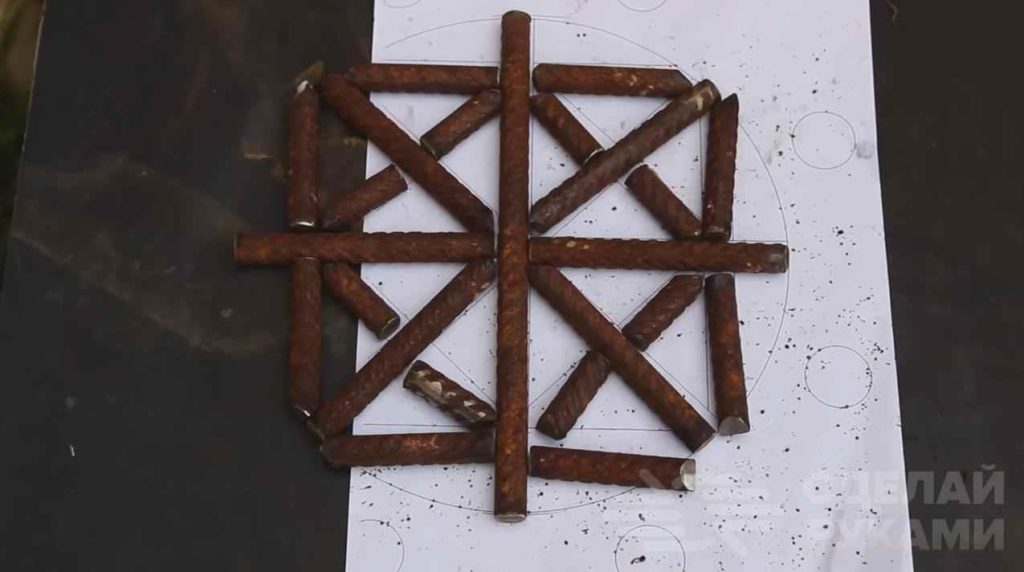 Теперь можно изготовить колосник. От арматурных прутков отрезаем заготовки необходимой длины и ввариваем их в центральное отверстие. Рисунок можно выбрать по желанию.