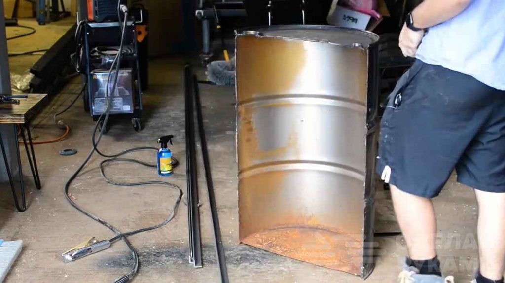 В первую очередь необходимо будет разрезать бочку пополам в продольном направлении. Края в месте среза нужно обработать напильником по металлу или отшлифовать лепестковым кругом, чтобы убрать заусенцы.