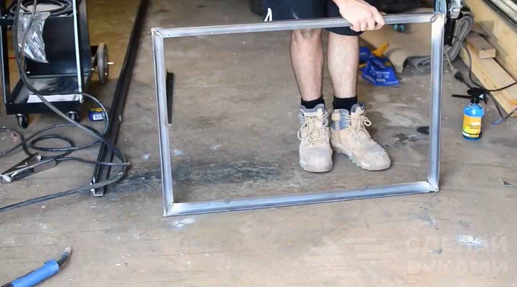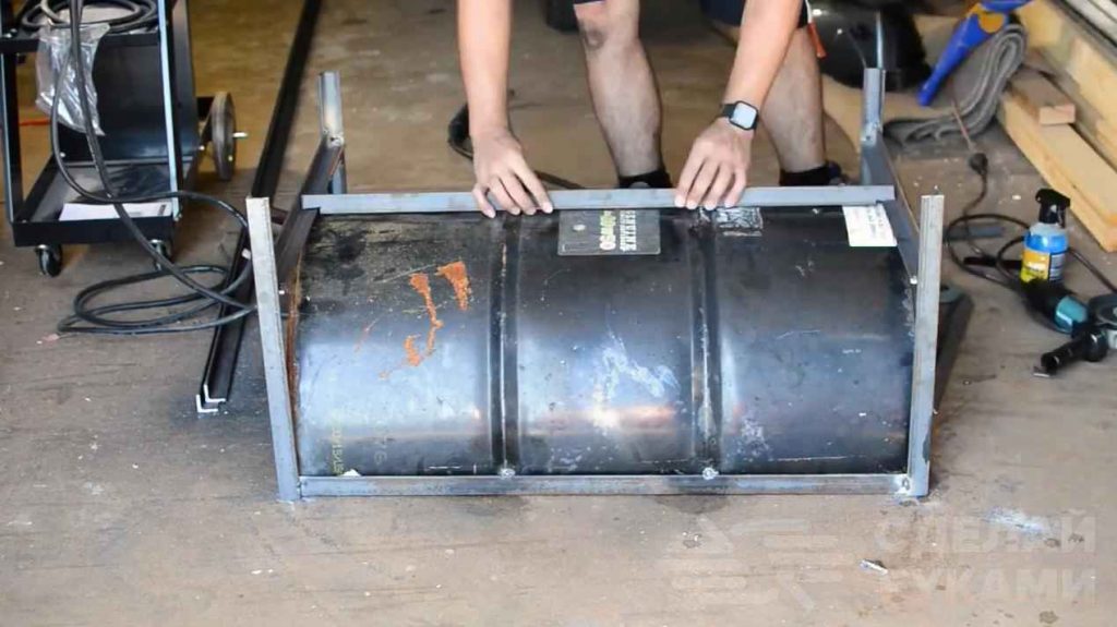 Потом к рамке нужно приварить четыре ножки, а между ними — проножки (для большей жесткости конструкции). После этого автор приваривает перемычку по длине бочки.