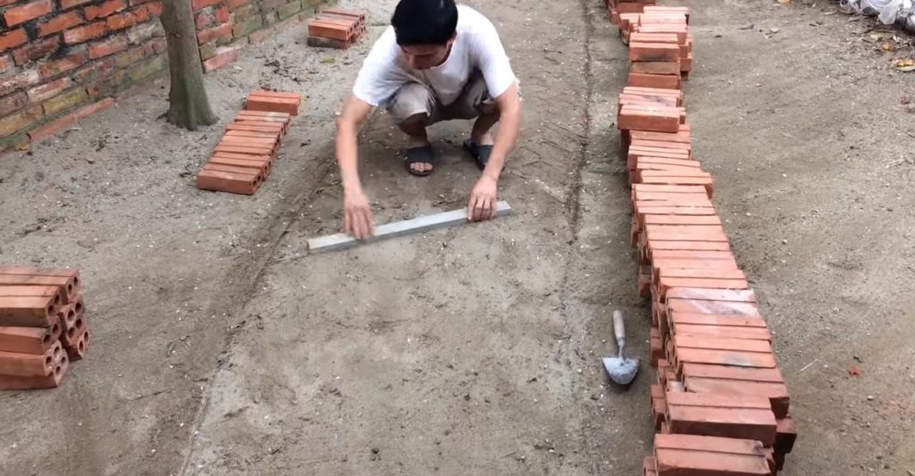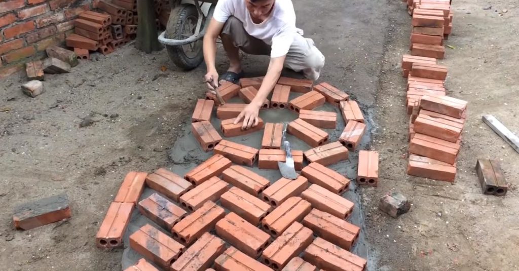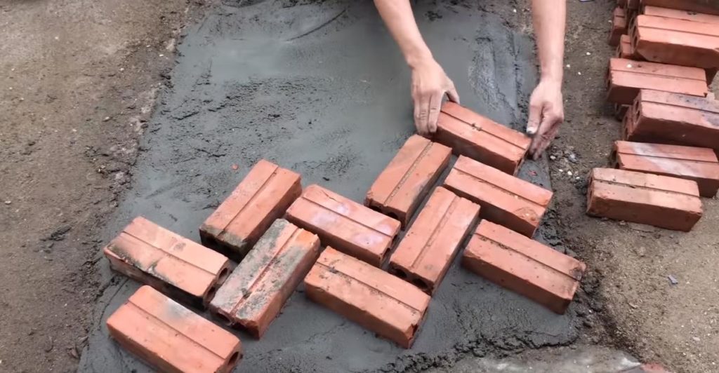 На основание автор выкладывает небольшое количество готового раствора, выравнивает его и начинает укладывать кирпичи елочкой.