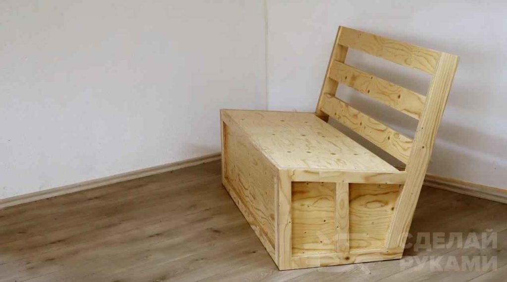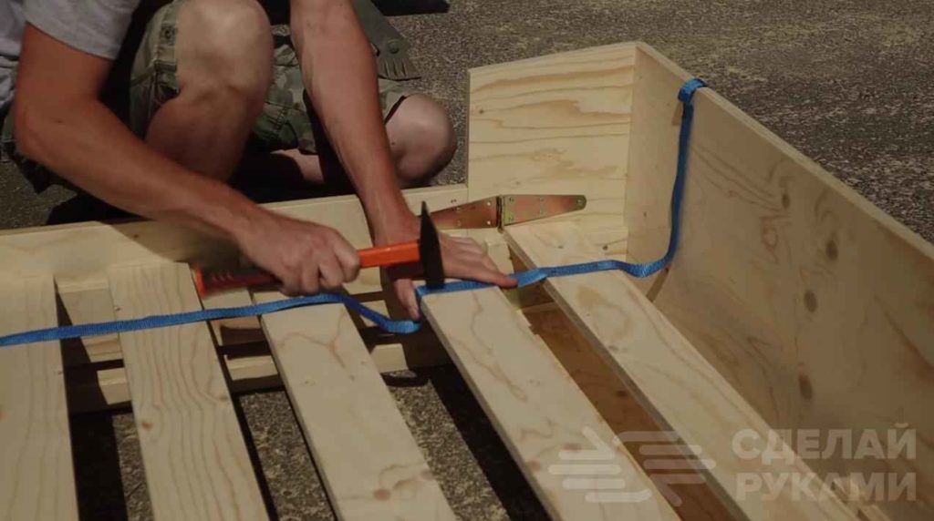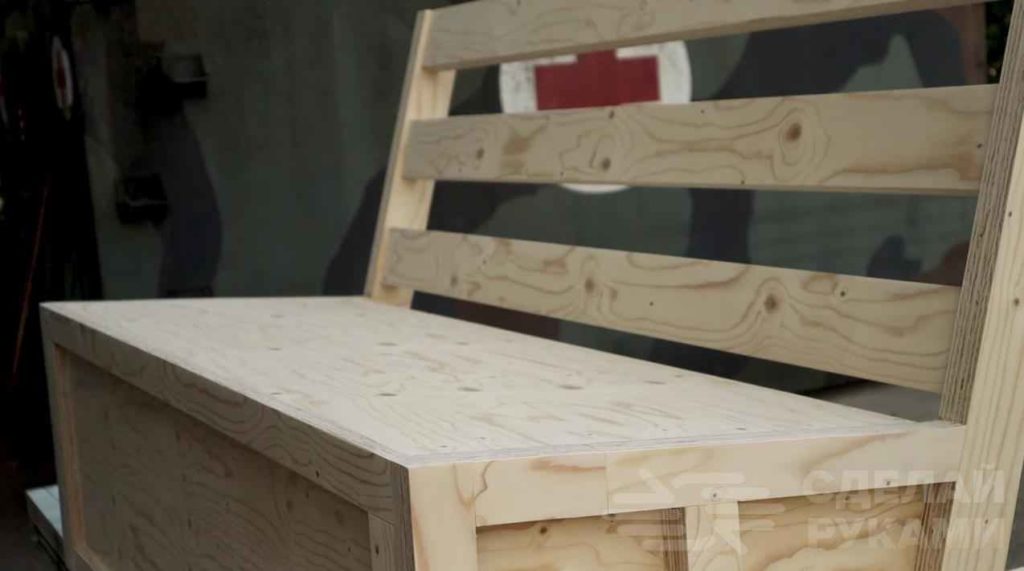 После этого автор прикручивает верхнюю часть каркаса (крышку), устанавливает опорные стойки и делает спинку, которая служит также изголовьем кровати.