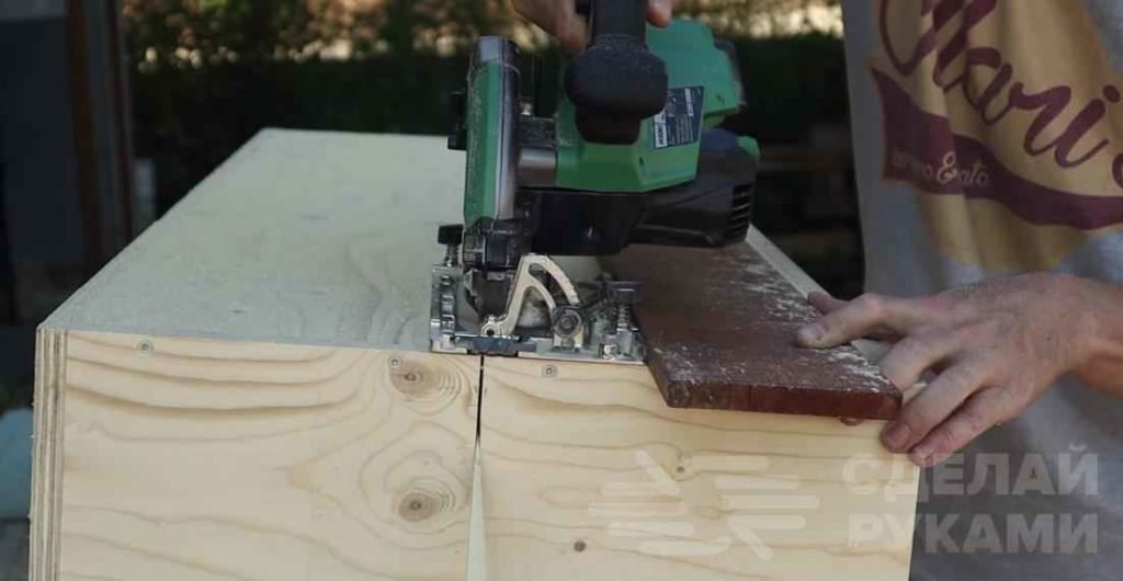 Первым делом автор распускает фанеру на листы нужного размера. Из них необходимо будет собрать короб прямоугольной формы. Затем автор распиливает короб вдоль на две одинаковые части при помощи ручной циркулярки.