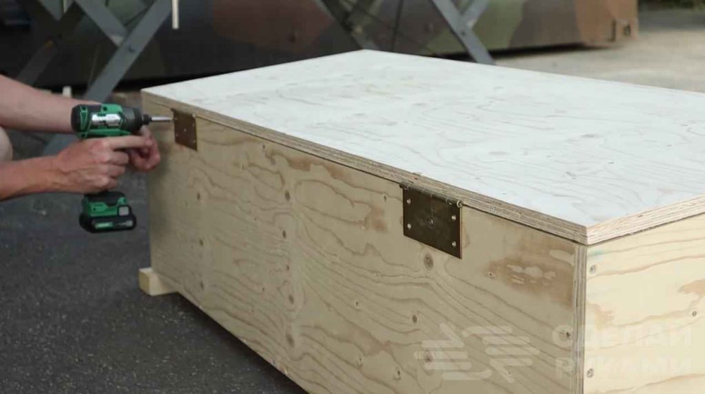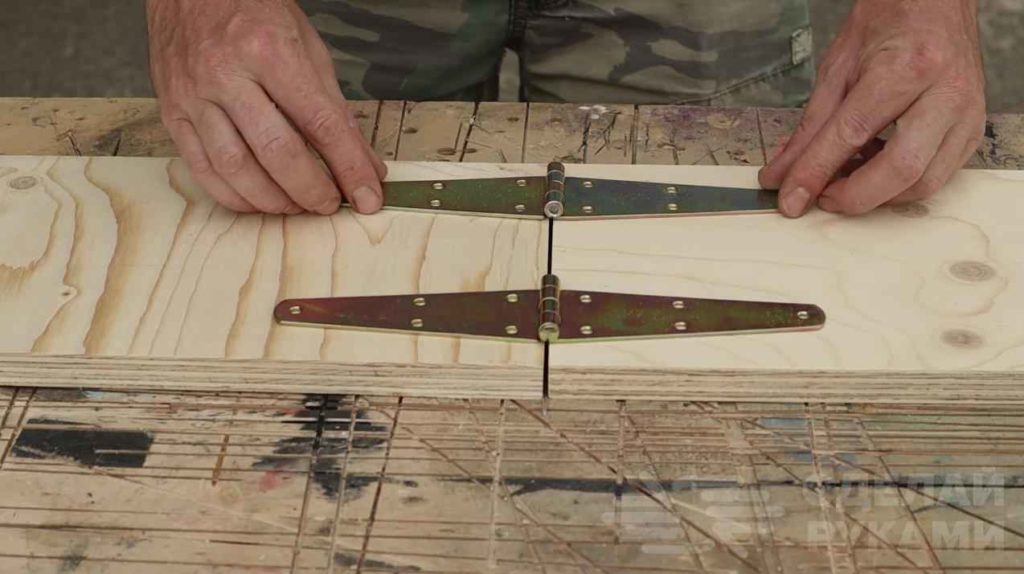 На следующем этапе нужно сделать складные царги. Для этого автор соединяет два куска фанеры с помощью петель. Всего же нужно будет три царги: две устанавливаются по бокам, третья — посередине.