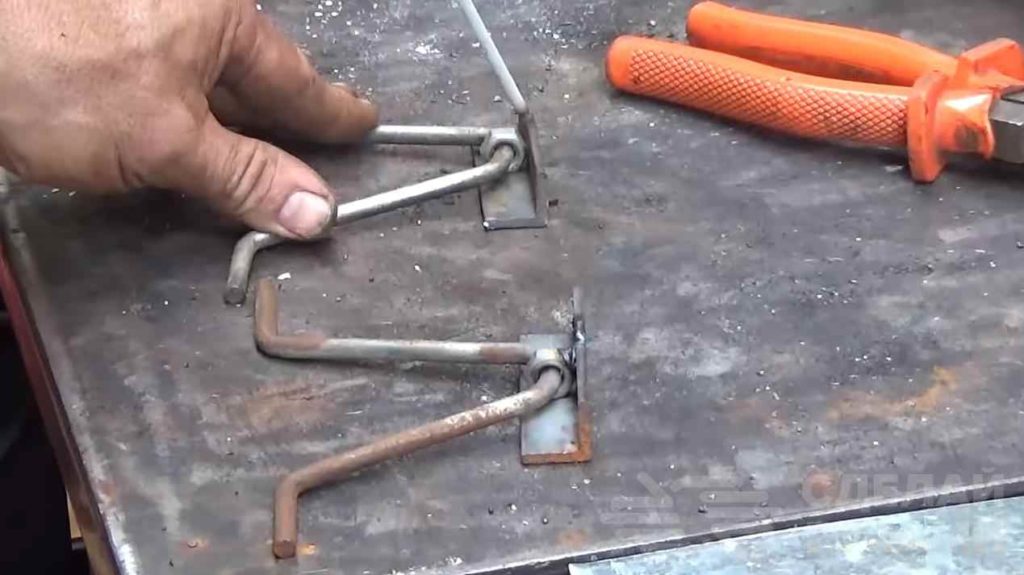 Потом автор отрезает еще два круглых прутка и приваривает их к предыдущим. В результате получились две половинки решетки. Из кусков уголка делаем ограничительные упоры.