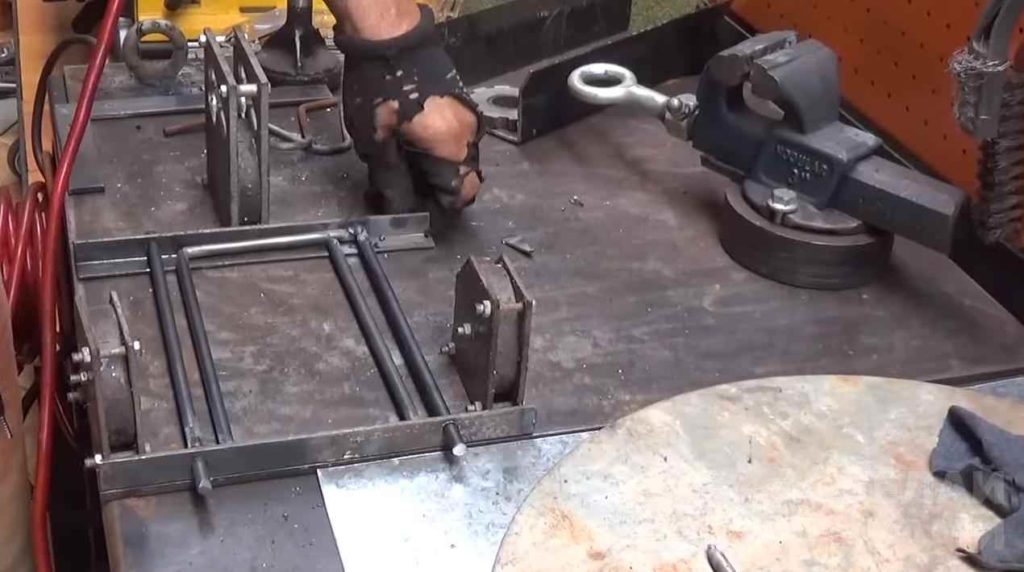 Первым делом автор отрезает два куска уголка и приваривает к ним гайки с вставленными в них заготовками из круглого прутка.