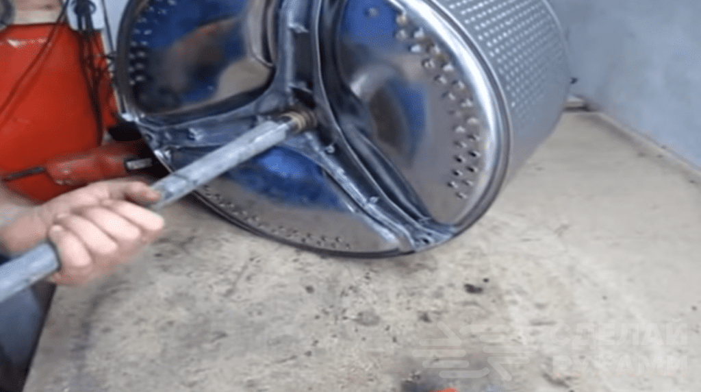 На вал барабана насаживаем стальную трубу длиной примерно 80–90 см, которая будет выполнять роль вертикальной стойки, на которой крепится мангал. На конце трубы нужно сделать небольшие вертикальные прорези и немного разогнуть получившиеся «лепестки» в стороны, чтобы она плотно «села» на вал.