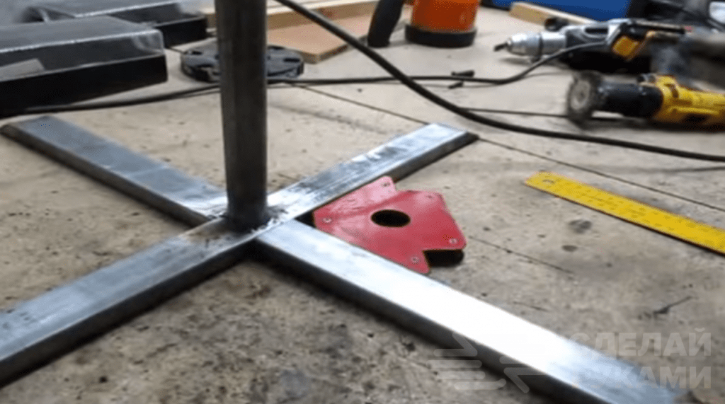 На последнем этапе работ к нижней части стойки привариваем кусок профильной трубы, а к нему — еще два по бокам, чтобы в итоге получилась крестовина. Чтобы выдержать правильный угол, для этого желательно использовать магнитный уголок.
