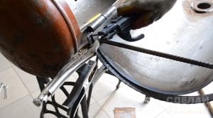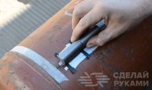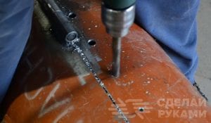 На завершающем этапе работ, когда петли уже приварены, делаем прорези для шампуров на расстоянии 6-7 см друг от друга и шириной 4 мм. Также с обратной стороны газового баллона необходимо сделать отверстия сверлом на 12 мм.
