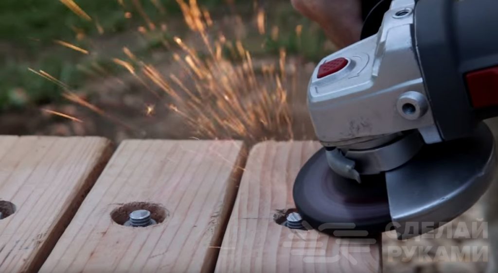 Торчащие части болта срежьте и зашлифуйте болгаркой. Осталось только покрыть дерево морилкой и скамейка готова.
