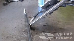 Для данной самоделки потребуется специальная прямоугольная «насадка», которая используется для газонных граблей, два колеса средних размеров, профильные трубы квадратного сечения разной длины, а также длинная шпилька и гайки. В первую очередь вставляем шпильку в профильную трубу и прихватываем ее сваркой, чтобы она не проворачивалась.