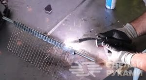 По центру трубы привариваем ручку (под углом в 45 градусов), которая собрана из трех квадратных профилей. Затем необходимо будет приварить решетчатую «насадку» к нижней части механических граблей. Далее сварные соединения и поверхность металла зачищаем при помощи шлифовального диска для болгарки.