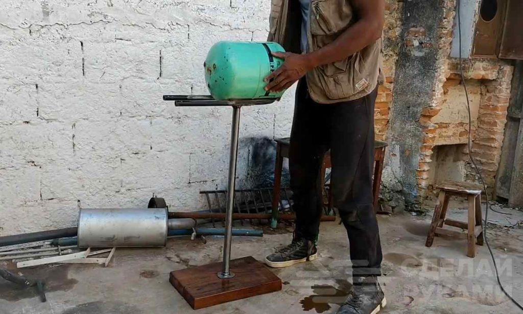 Отрезаем по размеру трубы и свариваем их вместе: в итоге получилась стойка и горизонтальная подставка для баллона. Потом крепим стойку к деревянному основанию.