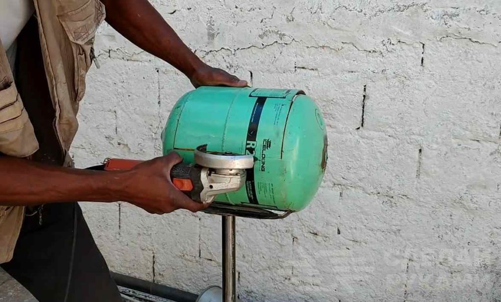На следующем этапе автор делает разметку на фреоновом баллоне и болгаркой вырезает дверцу.