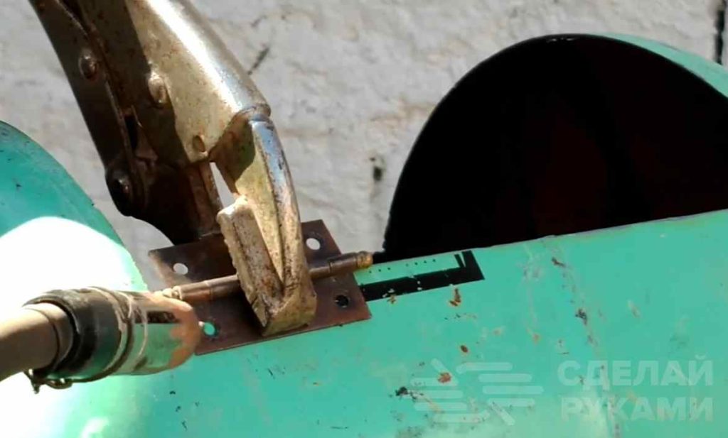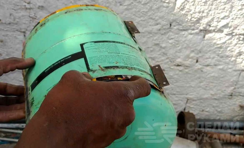 Перед этим к самой дверце по бокам мастер приваривает две металлические полосы, чтобы она не проваливалась внутрь баллона.