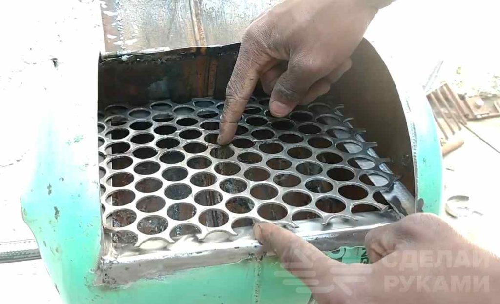 Далее внутри баллона нужно будет приварить отрезки уголка, к которым потом приваривается металлическая решетка.