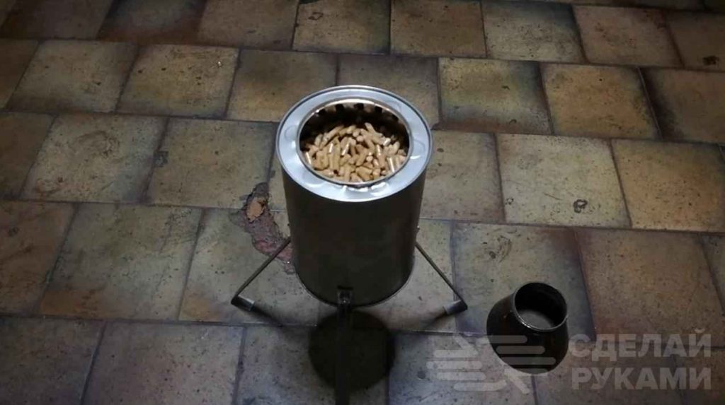 Внутрь самой банки можно засыпать древесные гранулы (пеллеты) или обычные мелкие ветки, которые должны быть сухие. Когда огонь уже разгорится вовсю, можно будет тогда и мокрые ветки подкидывать.