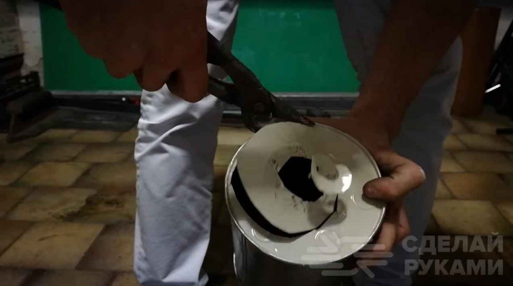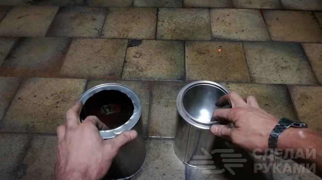 Для изготовления данной печки потребуется две жестяные банки разного диаметра. В той банке, которая побольше, необходимо вырезать дно. А потом надеваем ее на банку меньшего размера.