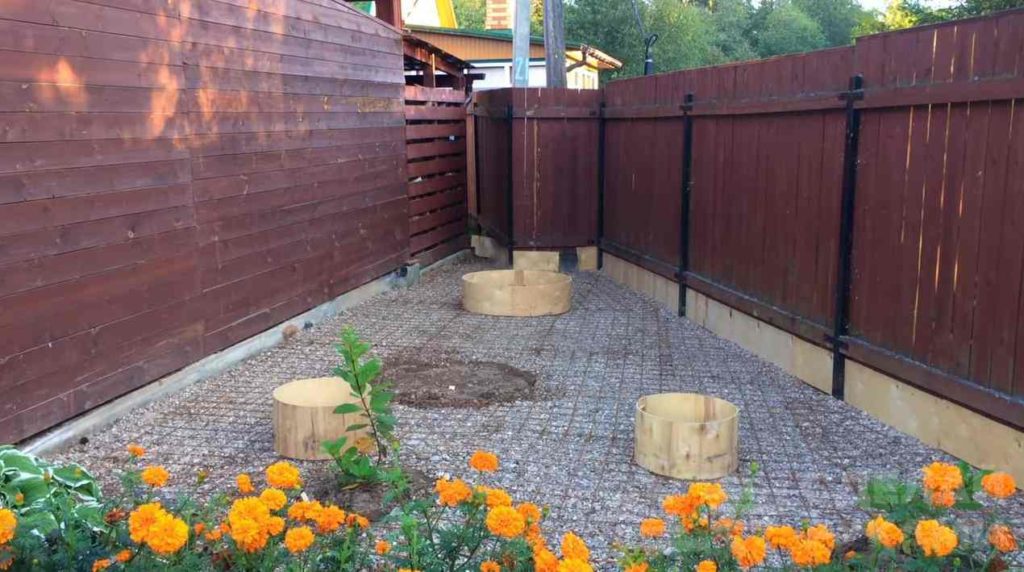 На следующем этапе выполняется засыпка участка щебнем и укладка армирующей сетки.