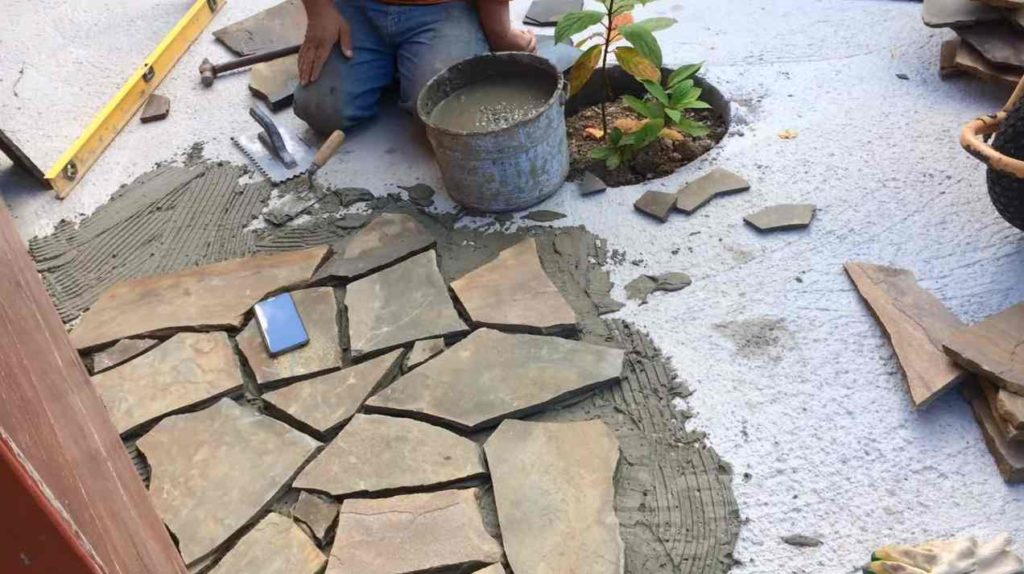 Укладка камня выполняется «мокрым» способом — то есть на плиточный клей. Также можно укладывать его «на сухую», но тогда бетонное основание не требуется.