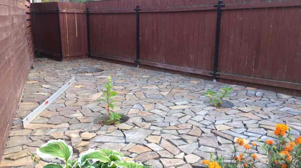 Когда бетон схватится, можно приступать к мощению участка диким камнем.