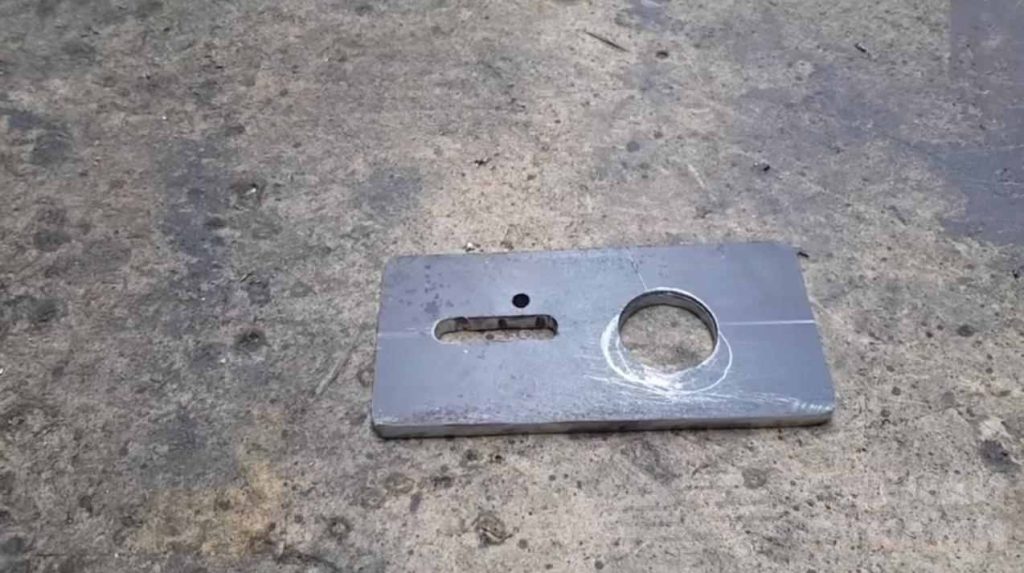 На следующем этапе необходимо будет отрезать небольшой кусок металлической пластины, просверлить в нем отверстие и сделать прорезь.