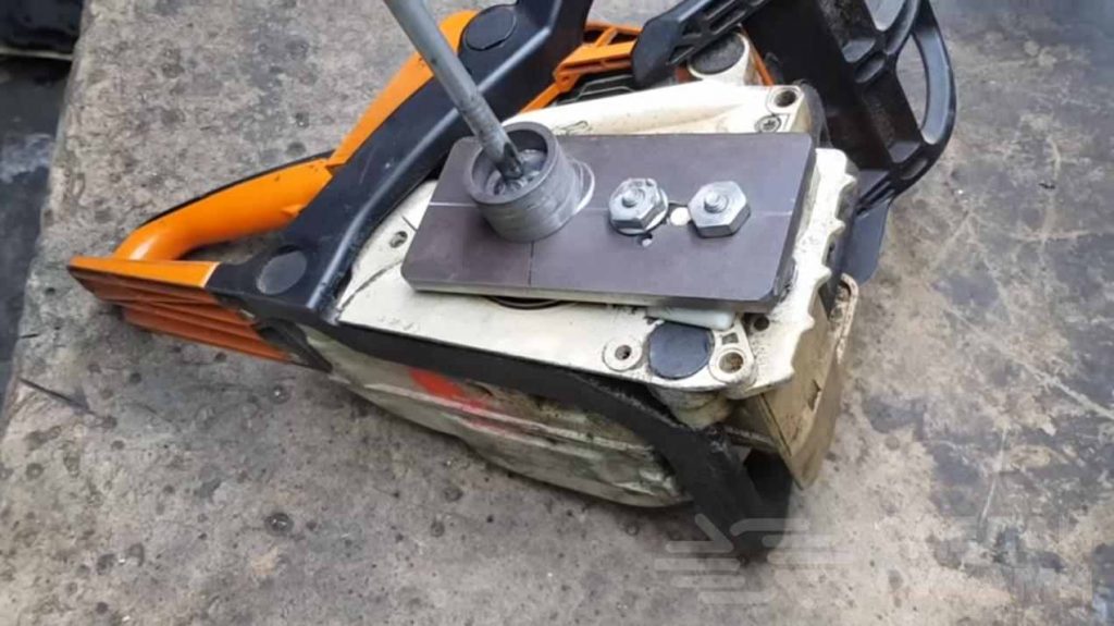Далее изготовленные детали устанавливаем на бензопилу. Сначала — кусок кругляка с шайбой под звездочку, потом — металлическая пластина. К ней еще надо будет приварить кольцо из толстостенной трубы.
