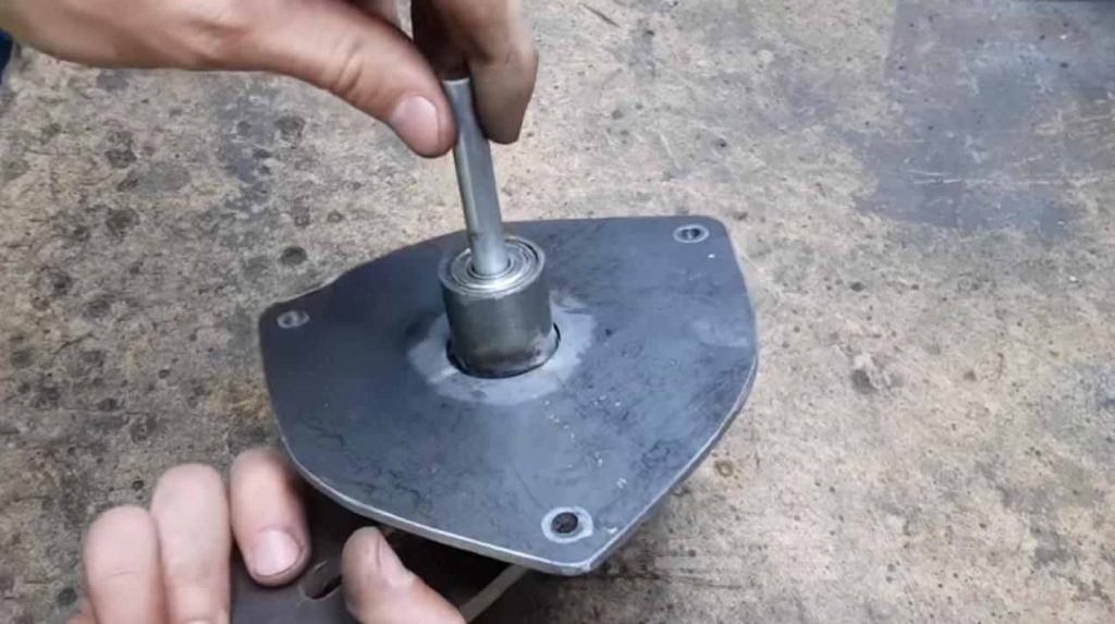А на сам пруток надевается втулка с подшипниками. Затем автор вырезает заготовку из пластины, сверлит в ней отверстия (три — по краям и одно — по центру), после чего приваривает к втулке.
