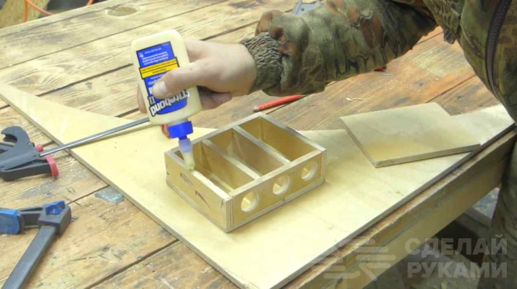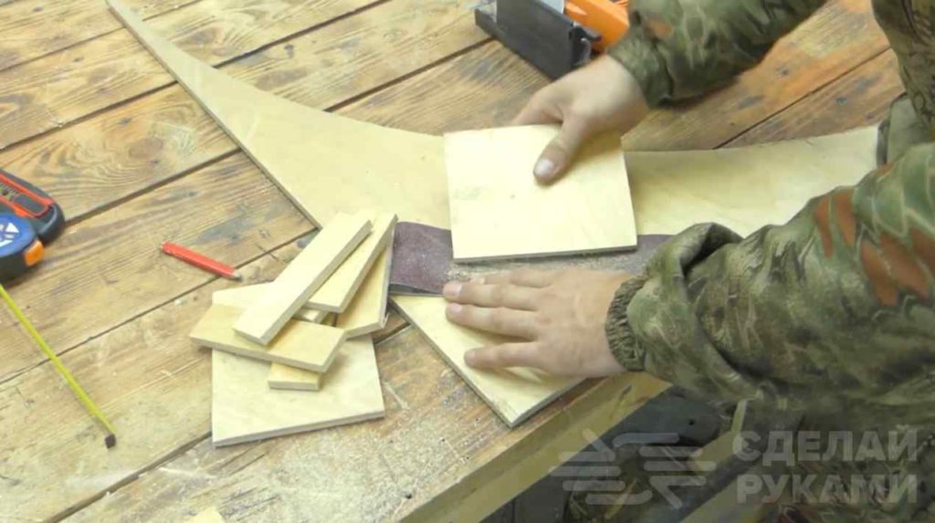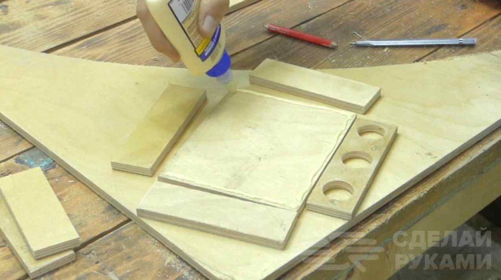 Первым делом из обрезков фанеры автор вырезает заготовки: две — квадратной формы и шесть — прямоугольной.